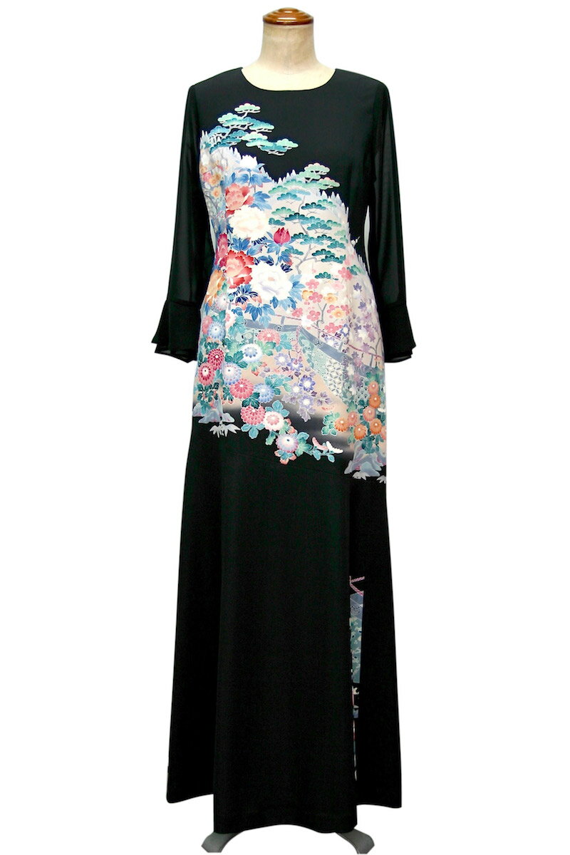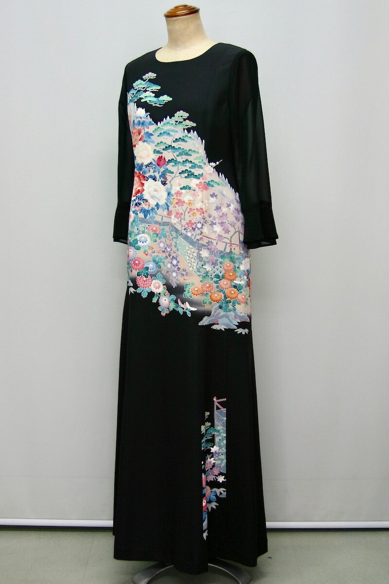 <この商品はメール便非対応商品です> サイズ 9号 バスト:94cm ウエスト:82cm ヒップ:107cm 丈:140cm 素材 表地:正絹(シルク100%)、裏地と袖:化繊 状態 新品の留袖からリメイク 製造国 日本 オーダーメイド、レンタルも承っております。