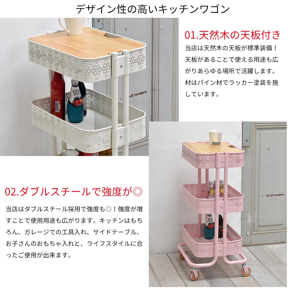 商品説明 バスケットにアラベスクをあしらった、天板付き・キャスター付きキッチンワゴン2段タイプ。