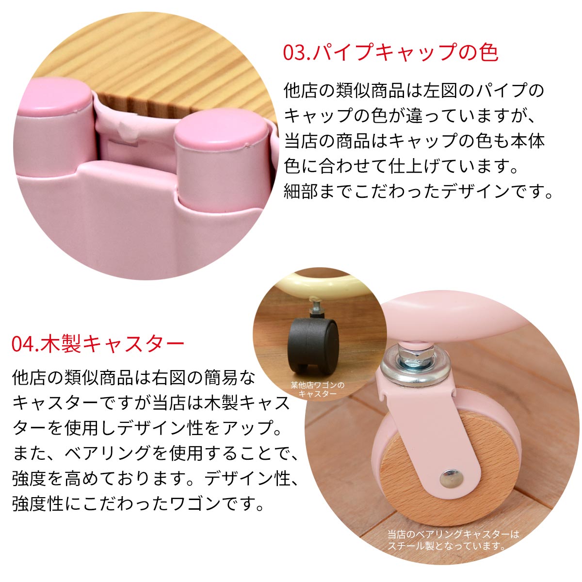 見た目にもこだわり、キャスターには天然木を使用したデザイン性の高いキッチンワゴンになっておりますソファ横に置いてブレイクタイムを楽しむだけでなく、衣類やタオルを収納するランドリーワゴンとして、食材の保管もできるキッチンワゴンとしまた、植物のディスプレイ台としてなど、アイデア次第で様々な用途にお使いいただけます。